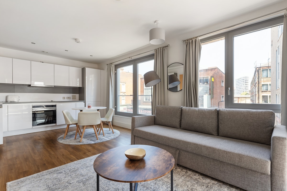 Moderno y elegante apartamento de 1 dormitorio cerca de las estaciones Dalston Junction y Dalston Kingsland, ¡perfecto para 4 huéspedes! Relájate con una cama tamaño king en el dormitorio y un sofá cama en la sala de estar. Disfruta de un acceso rápido a los lugares emblemáticos de Londres: a 15 minutos de Shoreditch, a 20 minutos de Camden Town y a 25 minutos del West End. Ideal para grupos y familias, este emocionante alojamiento cuenta con una cocina moderna, wifi rápido, balcón privado y enlaces fáciles para explorar las mejores zonas de la ciudad.