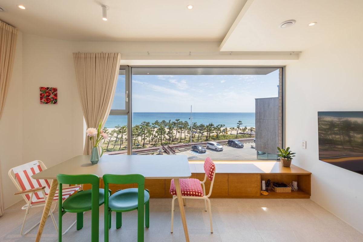 ✔️정동향의 넓은 발코니_ '프라이빗 힐링'이 가능한 말이 필요없는 뻥~ 뷰는 최고✌️ ✔️포근한 침대에서 벅찬 해돋이와 커피를 즐길 수 있는 -아늑하고 위생적인 침대에서 푹 잠, 맛과 향을 모두 살린 네스프레소 버츄어 캡슐 커피로 ^^ ✔️편안한 해변 산책로(데크길)로 양리단길까지 ✔️워케이션 센타에서 바다와 함께 대규모 모임을 ✔️넷플, 티빙, 쿠플, 디즈니플는 기본 제공^^ ✌️하루를 휴식할 때 파도소리 자장가는 덤 👍해바라기 수전의 수압 good~^^ 👉숙소 1층에 마트(GS마트, E마트), 걸어서 대형 마트(하나로 마트)까지 ✔️걸어서 파머스 키친, 발리 음식점, 막국수 맛집 등 ✔️건조기능을 겸비한 세탁기, 실내외 건조대 ✌️장기숙박에도 충분한 수납공간과 조리기구&식기류 구비 ✔️매력과 개성이 가득한 이곳에 한 번 발을 들이면 영원히 떠나고 싶지 않으실 거예요.^^ ☆전문 세탁소에서 고온 살균된 침구 ☆소독제 살포제를 사용한 객실 방역 ☆비대면 체크인