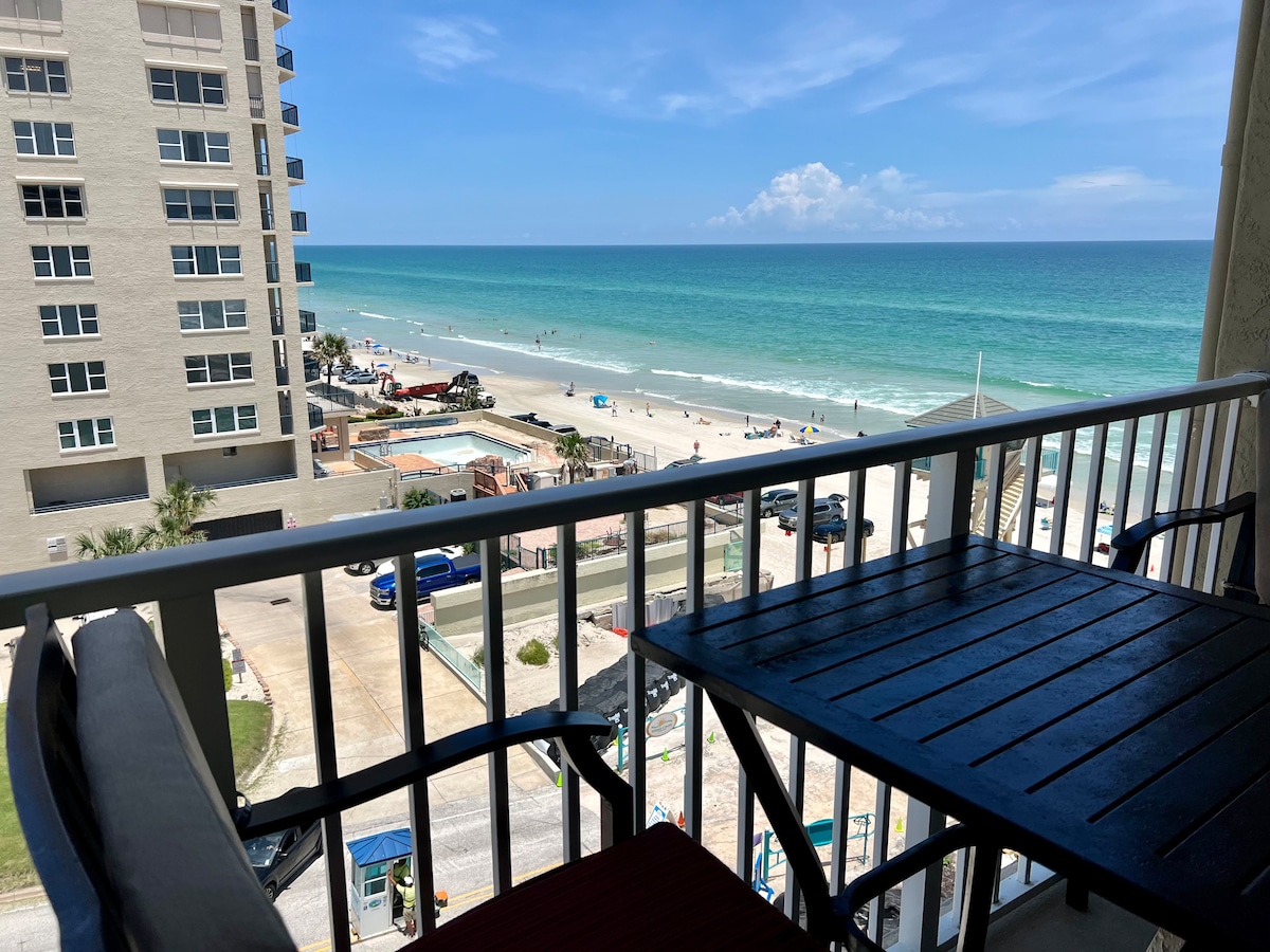We are located on Daytona Beach a 1 minute walk through the pool area to be on the beach POOL IS OPEN AND INDOOR POOL IS OPEN Kick back and relax in our newly remodeled calm and stylish space. we have a full size refrigerator, you will fall in love with our balcony views. we have all pots and pans and kitchen supplies. all linens and beach towels included. we have 1 king bed and a futon couch big enough for 1 adult or 2 small children.