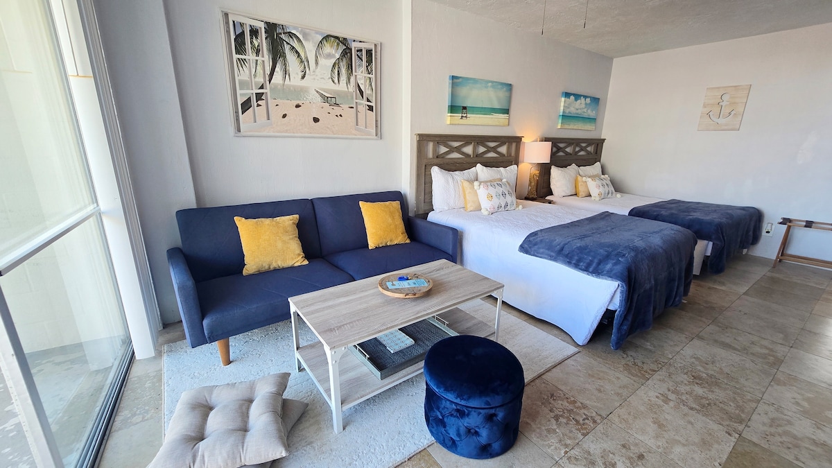 Experience a relaxing stay in this modern, renovated Harbor Beach Resort condo. Enjoy beautiful sunsets and take a short elevator ride to the beachside in the morning for the sunrise. Unwind at the pool overlooking the beach, or make use of the gym, game room, and on-site laundry. The 375 sq ft unit features two queen beds, a Smart TV, and a fully equipped kitchenette for easy meals. Complimentary coffee, fresh towels, toiletries, and free parking ensure an effortless Daytona Beach getaway.