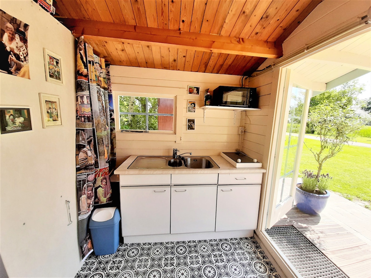 La minicasa es un antiguo garaje en el patio de la casa blanca, llamado Paradyske. La cómoda cabaña consta de una habitación con una cama doble y una mesa y con dos sillas. Además, hay un lujoso baño con ducha, lavabo e inodoro. El espacio entero tiene calefacción por suelo radiante y está bien aislada. Desde la cabaña tienes una vista del Langweerder Wielen.