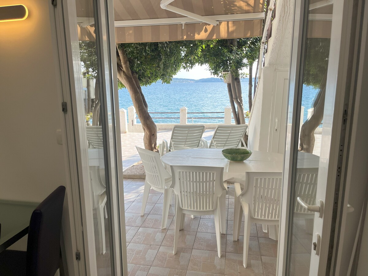 Esta propiedad está situada directamente junto al mar. Disfruta de las comodidades de nuestro apartamento; es espacioso, siéntete libre de caminar descalzo por el suelo de madera... después de un baño temprano por la mañana, disfruta de un café en nuestro balcón o en nuestra sala de estar, ambos con increíbles vistas al mar, mira las regatas, maravillosas puestas de sol, con un poco de suerte incluso delfines... haz una barbacoa en nuestro jardín/zona de parrilla bajo la sombra de las vides, o simplemente coge una de nuestras bicicletas y da un agradable paseo en bicicleta...