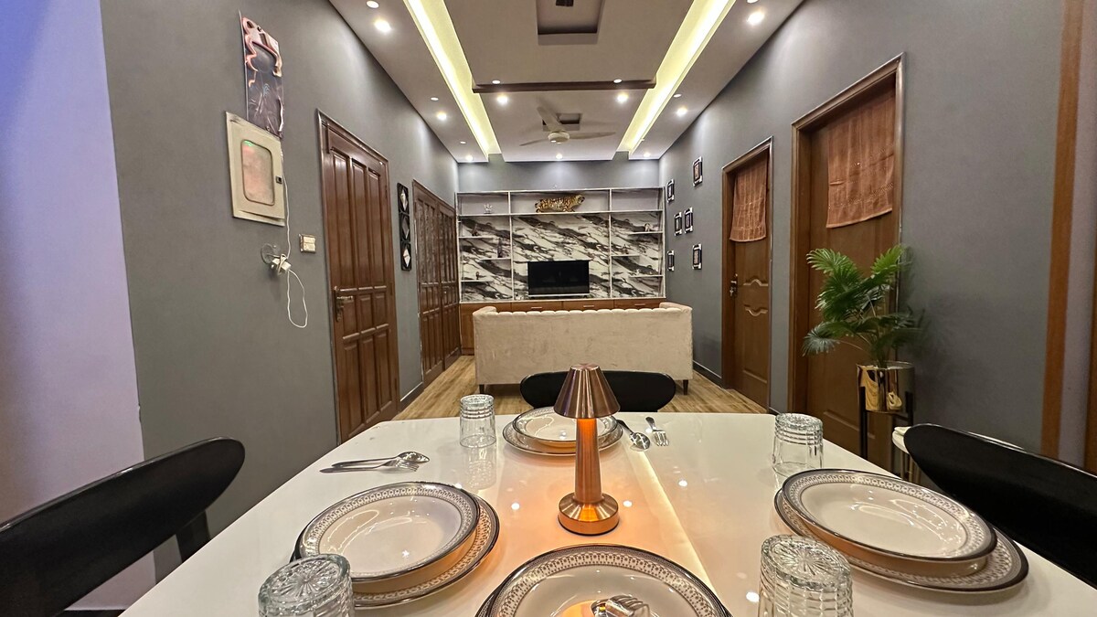 Meem Choti - Disfrutá de unas vacaciones con temática griega en este departamento con temática mediterránea ubicado en el pequeño centro comercial bukhari, DHA Fase 6. No hay restricciones para ningún huésped (solteros, parejas, solteros). La playa está a 1 km y hay varios restaurantes abajo. (Burridos, Cloudnaan, Burger Boss, etc.). Hay revistas, juegos de mesa y ajedrez disponibles. Check-in autónomo a través del cuidador. El departamento está en el tercer piso con acceso a la azotea.