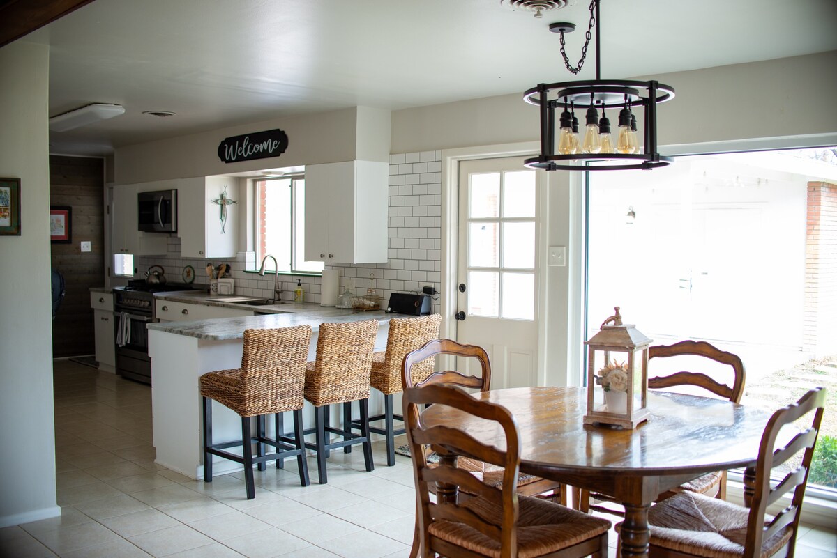 A charming 3-Bed, 2-Bath home in historic south Del Rio. Surrounded by beautiful churches and the historic downtown, this home provides a quiet and unique place to stay. Inside the Home: This home includes a spacious Master Bedroom with a king size bed and fully sized bath with a beautiful vanity and spacious shower. The second bedroom offers two twin beds, and the third bedroom has a queen size bed that both share a bathroom. Enjoy a family of 8 in the spacious dinning room and kitchen!