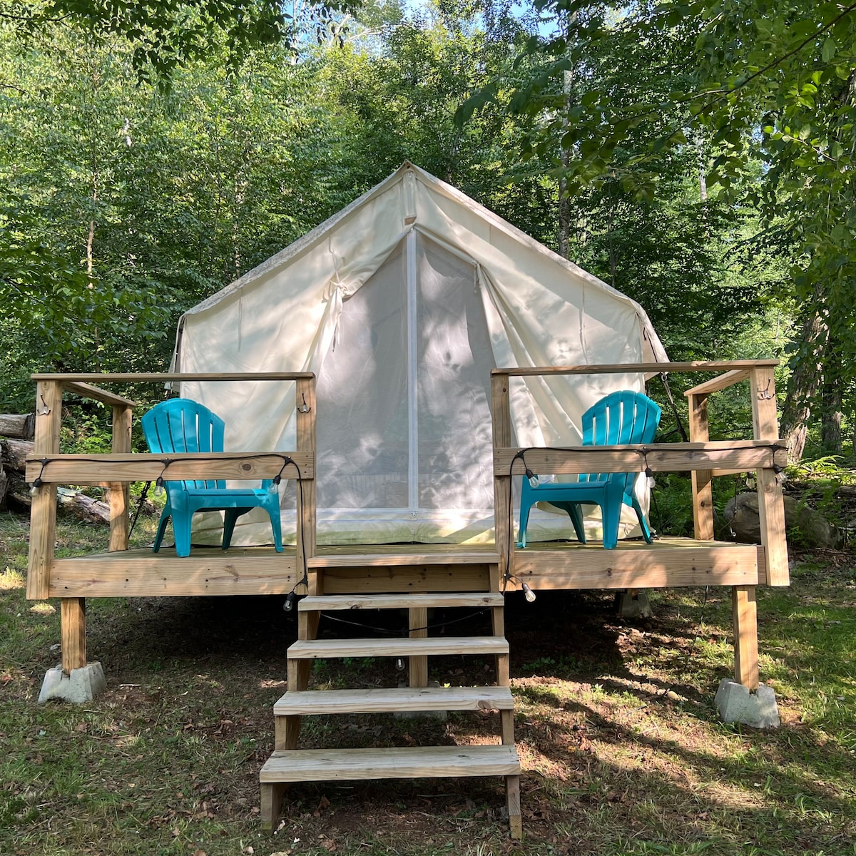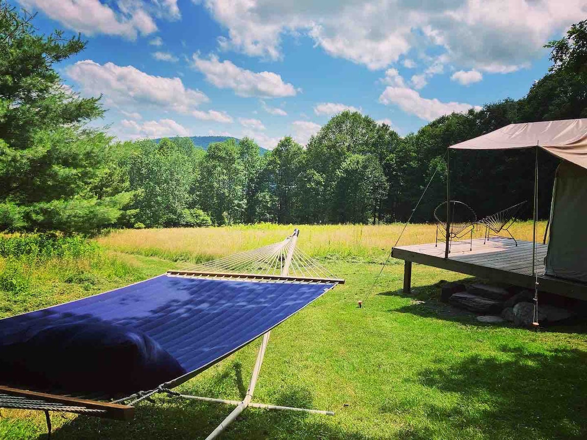¡Una escapada o aventura perfecta para amigos, parejas o familias pequeñas! Este anuncio es para una de las 4 tiendas de campaña elevadas, ubicadas en la cima de una colina, con una hermosa vista. La tienda tiene 1 cama tamaño queen, un conjunto de estantes y cajones para almacenamiento y un porche delantero para relajarse. Hay un pozo para hacer fogatas, letrinas, duchas al aire libre (¡solo frías!), senderos en el bosque para pasear y un arroyo para vadear. Trae tus comestibles: ¡hay una cocina al aire libre totalmente equipada con parrillas, neveras y todas las necesidades!