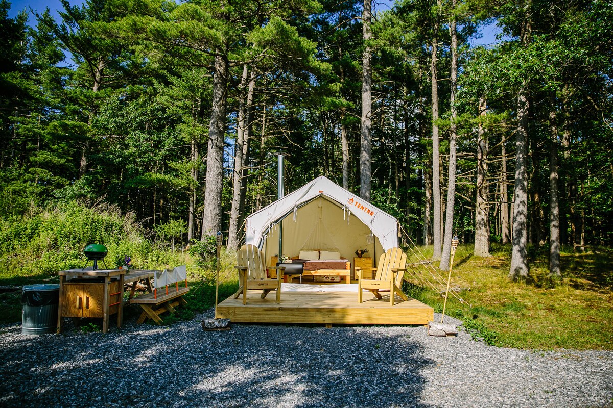 Venture to the endless mountains and relax in your own cozy glamping tent. Experience the perfect blend of nature and comfort—just bring your food and drinks. We provide a queen-size bed with soft sheets and warm blankets for a restful night’s sleep. Step outside your tent to unwind on your deck and take in some of the best sunset views in NEPA. HIGHLIGHTS ✓ Cozy space for two ✓ Stargazing, and (communal/shared) hot tub, outdoor kitchenette, fire pit ✓ Trails, views & outdoor peace