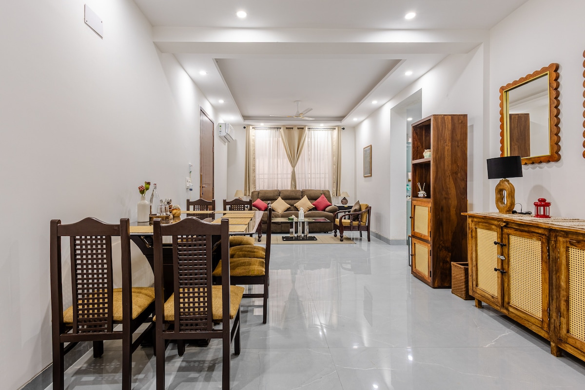 Attention: In peak season, place is booked very quickly! Experience unparalleled luxury in this exquisite South Delhi 3-bedroom floor in a house, in exclusive and gated Sainik Farms, located close to malls and Saket Metro Station. Bespoke Statuario Italian marble floors, hand-crafted furniture & spacious bedrooms with private balconies. Unwind in spa-like bathrooms with bathtubs, AI-based climate control, a fully equipped modular kitchen, and serene outdoor space.