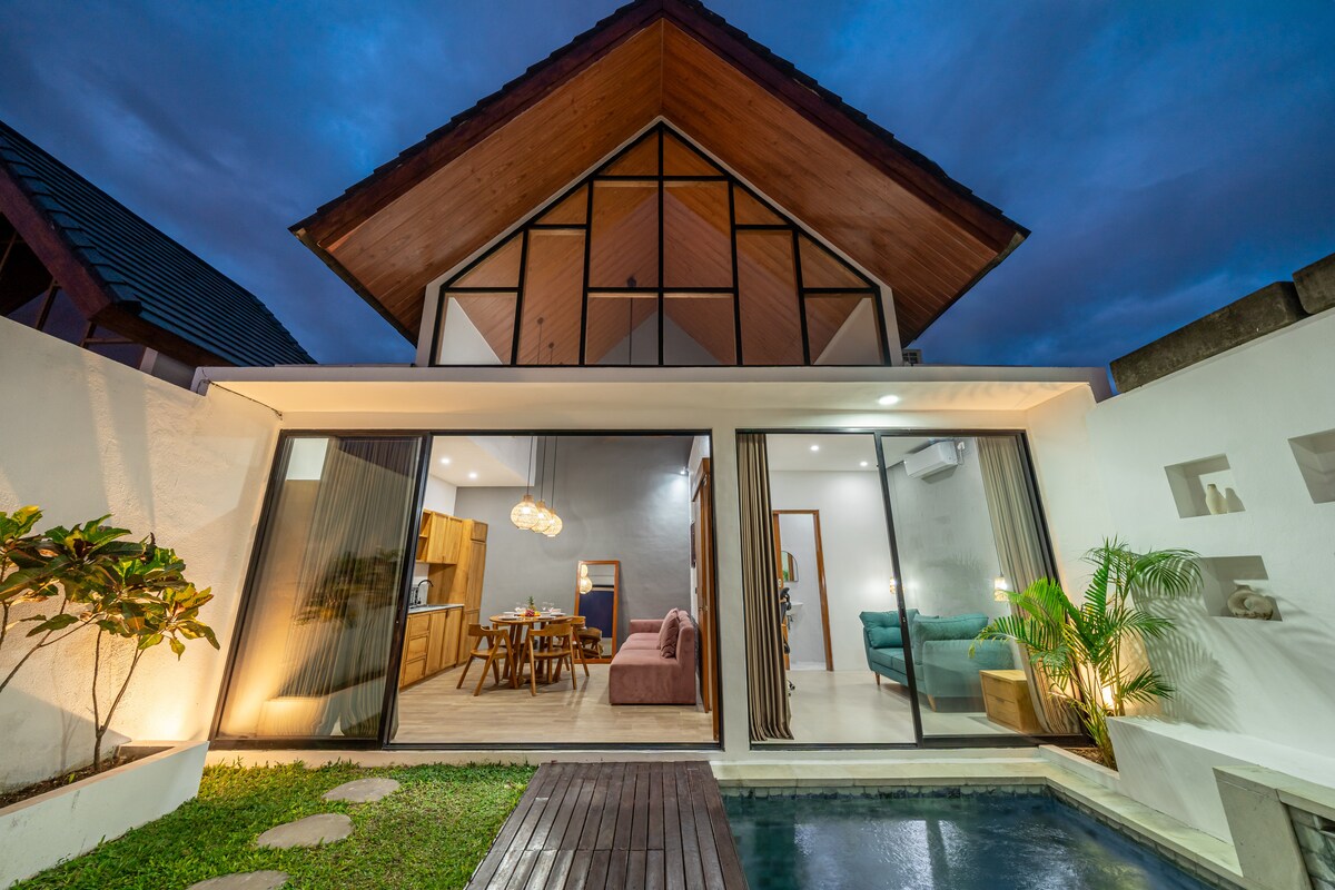 Despiértate con vistas a nuestro jardín tropical, mientras abres las puertas de cristal para dar la bienvenida a la brisa de la mañana. Disfruta del desayuno en la sala de estar al aire libre y relájate junto a la piscina para tomar el sol. Qué esperar: 2 dormitorios con baño privado/sala de estar al aire libre con cocina equipada/piscina privada con terraza y tumbonas/wifi de fibra óptica de alta velocidad/limpieza 6 días a la semana/ubicado en un barrio residencial tranquilo en Seminyak/servicios de conserjería, apoyo y asistencia las 24 horas, los 7 días de la semana y más.