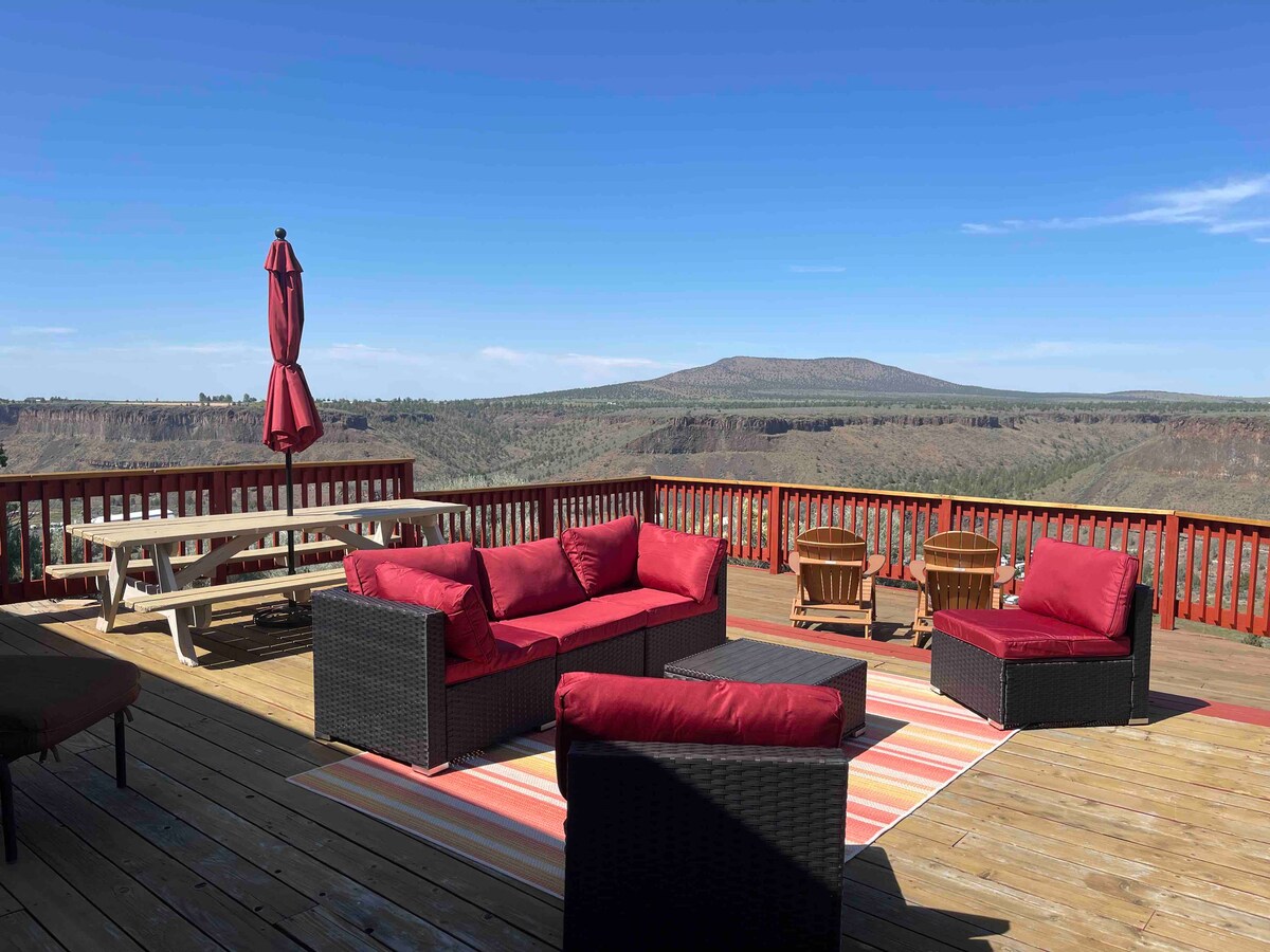 Prepárate para sorprenderte con los asombrosos amaneceres, atardeceres y amaneceres impresionantes que disfrutarás en Pointe of Blessing. Creemos que nuestro refugio en el cañón es un regalo de Dios demasiado bueno para guardárselo solo para nosotros. Nuestra acogedora casa se encuentra en la cima de un afloramiento de roca que sobresale del borde del cañón, lo que nos brinda vistas sin obstáculos hacia arriba y hacia abajo a lo largo del cañón del río Crooked. Tenemos vista a varios hoyos del campo de golf Crooked River Ranch y se puede ver Smith Rock a lo lejos hacia el sur.