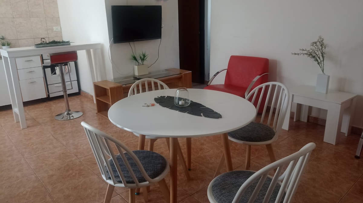Disfruta de un alojamiento en pleno centro de la ciudad. Un departamento moderno, nuevo, para descansar y pasar unos días super cómodo en un espacio luminoso y confortable Cuenta con un hermoso patio con parrilla, utensillos y cubiertos para 4 personas. Además posee cocina, microondas, aire acondicionado y heladera. La ubicación es excelente A 200mtrs de la calle céntrica y plaza principal. A 200mtrs de un supermercado.