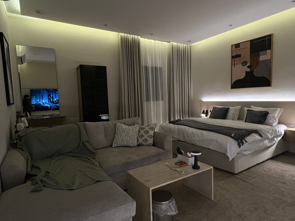 Elegant apartment with hotel services available - Hospitality service: add tea - coffee - sugar - water - Health service: shampoo - salper - soap - - wipes - knights and paste - Free internet service. - Self-entry -Private parking -Shahid account -Kitchenette . Close to supermarket, restaurant, coffee, laundry, few meters. Diriyah is about 8 km away and the Boulevard is 10 km 2A2 metro station is about 14 minutes away and Irqa 501 bus station is about 10 minutes away