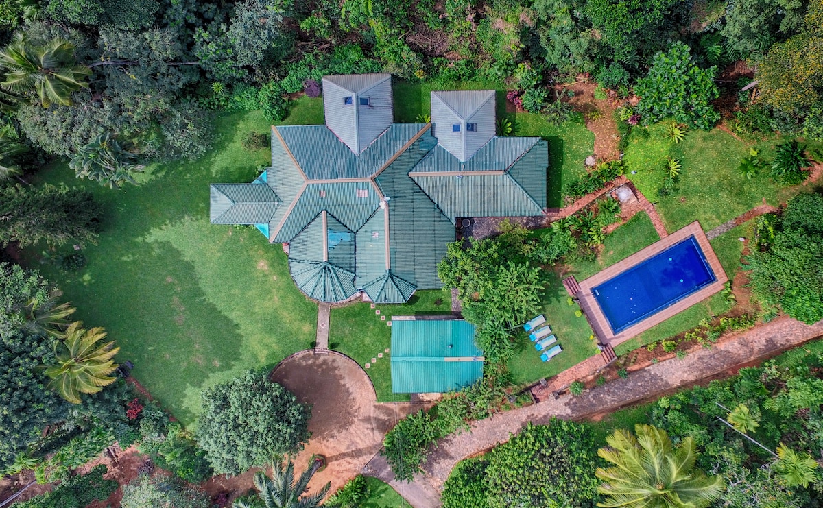 Tropical boutique villa with a colonial twist, fully staffed, nested among mountains and forests with a large outdoor sitting area and a beautiful pool. Limited time discounts active🍀 Decorated and built to give you a star class feel. Rest and Tranquility guarantee and just a 10-15 minutes drive away to the city and the Great temple of the tooth relic in Kandy City. Sleeps 16, among 7 bedrooms, all with AC and ensuite bathrooms (including 1 room a cot and two triple rooms).