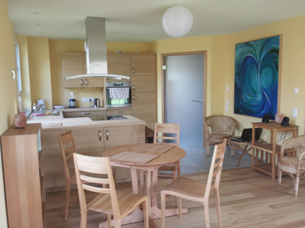 Bienvenido a nuestro encantador apartamento nivelado con su propia entrada a la casa, perfecto para una estancia relajante. La propiedad ofrece todo lo que necesitas: una cocina totalmente equipada, TV por cable, así como wifi gratuito para relajarse por las noches o trabajar desde casa. Un punto culminante especial es el prado adyacente con cenador, ideal para un desayuno acogedor al aire libre. Ya sea para un fin de semana o una estancia más larga, aquí puedes sentirte como en casa.