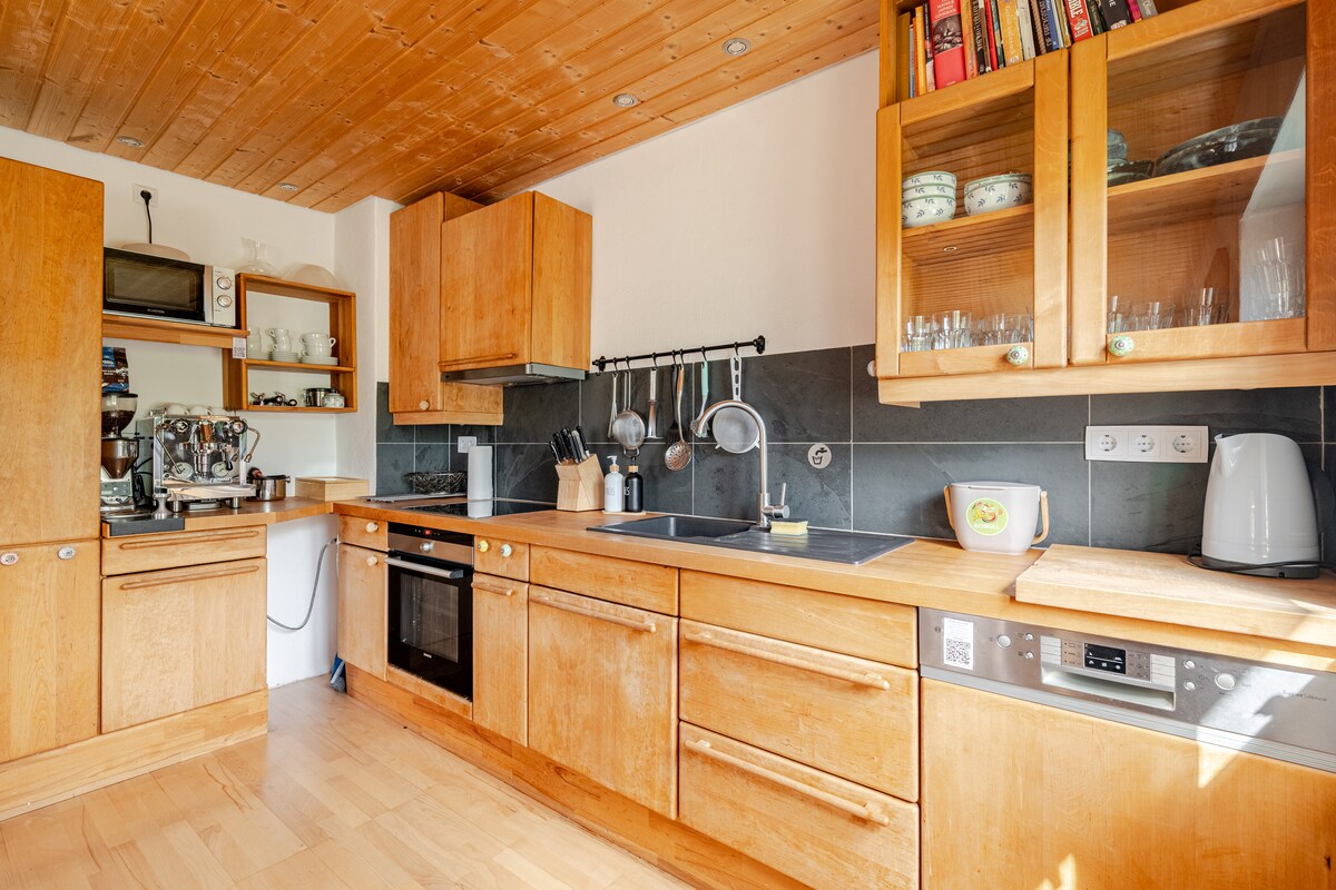Amplio y acogedor apartamento de 4 habitaciones en el segundo piso con estacionamiento. Equipado con artesanías y originales valiosos en el estilo de la Selva Negra. Vista única del Sanagarten y la catedral. En 100 m2 hay 2 dormitorios, una cocina, sala de estar y baño y un invernadero como comedor. Jardín compartido posible.Desde2021puede utilizar nuestra gardensauna. Se puede llegar al centro de la ciudad en menos de 10 minutos a pie. Ideal para atletas /buscadores de paz. No apto para niños y animales.