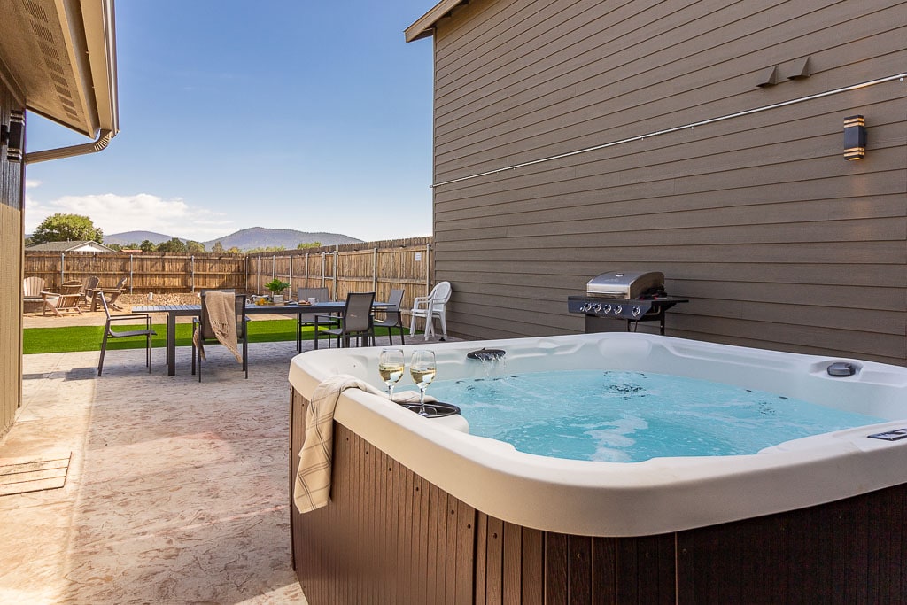 Juega todo el día, relajate toda la noche. Tu refugio privado de montaña con 3 camas cuenta con una cancha de pickleball dedicada, un jacuzzi burbujeante y una fogata crepitante, a solo 15 minutos del entretenimiento del centro de la ciudad. Dormí tranquilo: tres dormitorios espaciosos, sábanas lujosas y persianas que oscurecen la habitación. Cocina y barra de café completamente equipadas Wifi rápido y aire acondicionado para mayor comodidad durante todo el año Televisión inteligente El check-in sin restricción de horario con cerradura inteligente te permite llegar cuando quieras.