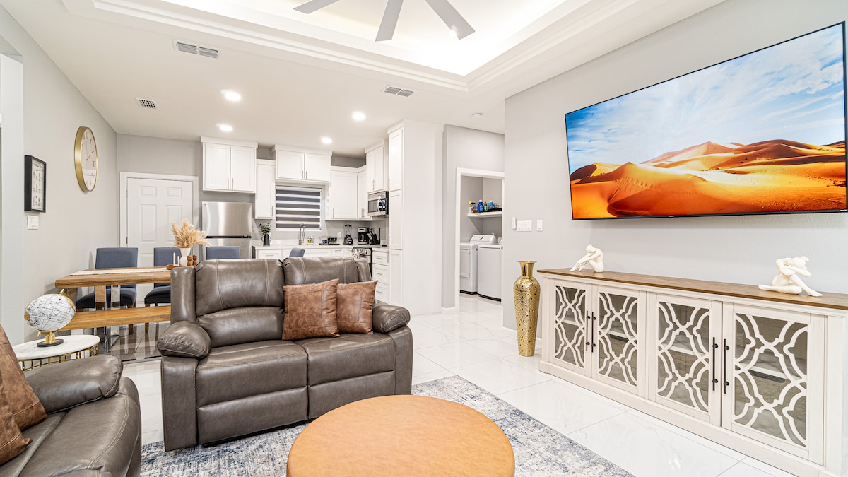 Gated community with a golf course with night security patrols. The town home has 3 bedrooms: a large king suite, a guest room with a queen bed, and a guest room with a sofa bed and movie theatre setup. Full kitchen has a premium appliances, two dining tables, filtered water and bar seating. Parking includes a single-car parking garage, driveway, and block driveway. Washer/dryer combo. Fiber internet. Flexible cancelation for state and federal workers.