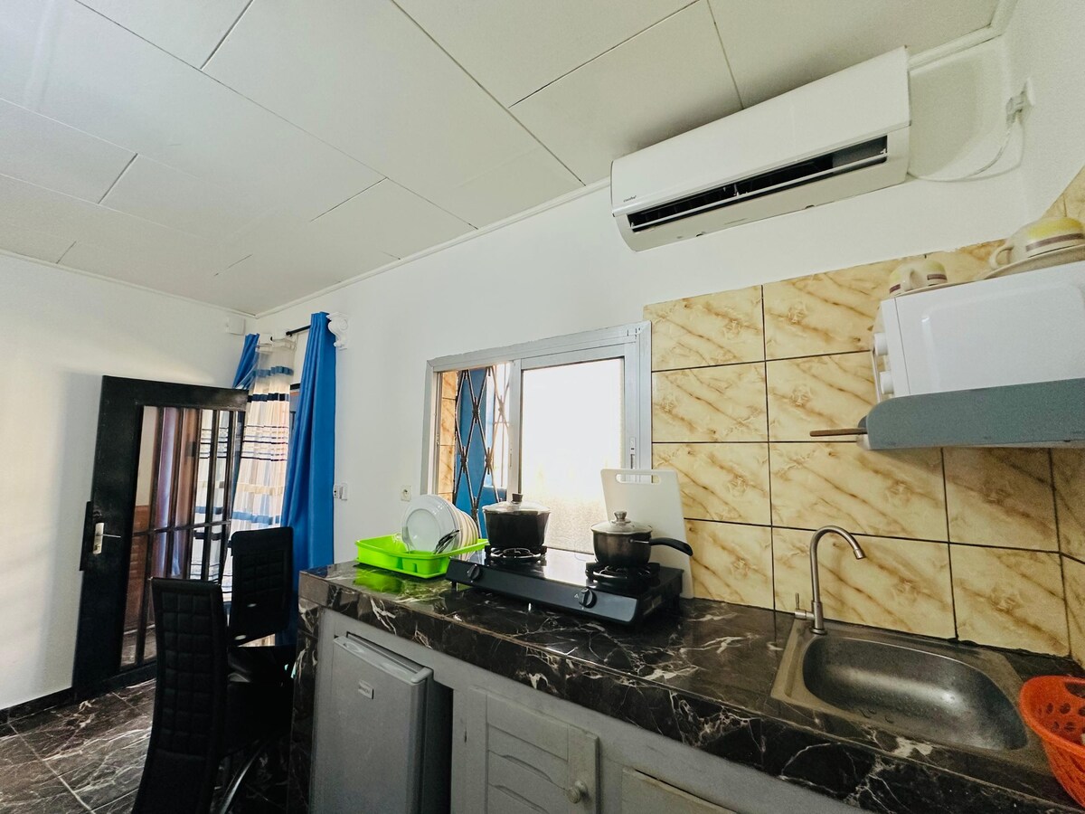 Cozy apartment in a secure residence, generator, well, and cleaning included—perfect for a wonderful stay solo or as a couple! - Bedroom with double bed, airco - Large living room: TV, CanalSat, airco, high-speed Wi-Fi - Bathroom with shower and toilet - Bed linen/towels provided - Fully equipped kitchen with loggia - parking Located in Makepe BM, just 20 meters from the cobblestone street, close to shops, restaurants, and public transport. A calm and welcoming setting for an enjoyable stay!