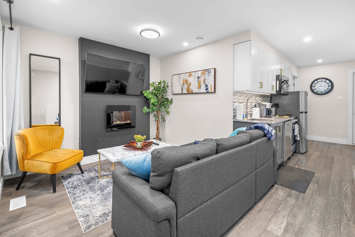 Este es un espacio de sótano cómodo, luminoso, limpio, tranquilo y grande de 1 dormitorio con techos altos. Cuenta con modernas comodidades de cocina con encimera de cuarzo y electrodomésticos de acero inoxidable, un comedor, sala de estar y baño de 3 piezas con ducha a presión. Tu espacio tiene una cómoda entrada sin llave y una plaza de aparcamiento a pocos pasos de la puerta principal... ¡todo para ti!