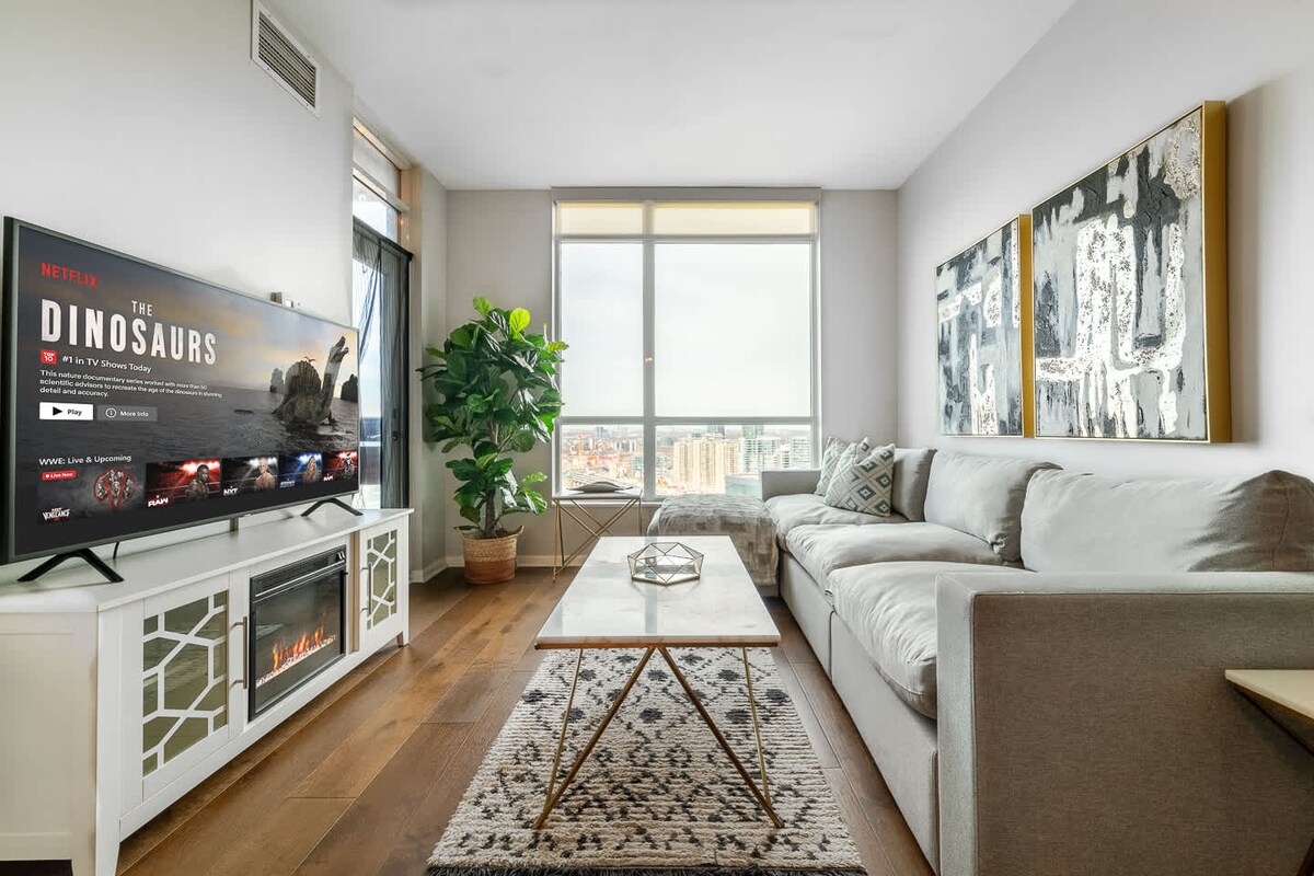 Stay in the heart of downtown Toronto in this modern one-bedroom condo just steps from the CN Tower, Rogers Centre, and the waterfront. The unit features a comfortable queen bed in the bedroom and a sofa bed in the living room, perfect for couples or small groups. Enjoy skyline views through floor-to-ceiling windows or relax on the private balcony. The condo includes a full kitchen, smart TV, high-speed Wi-Fi, and in-suite washer and dryer. Guests also have access to a gym and outdoor pool .