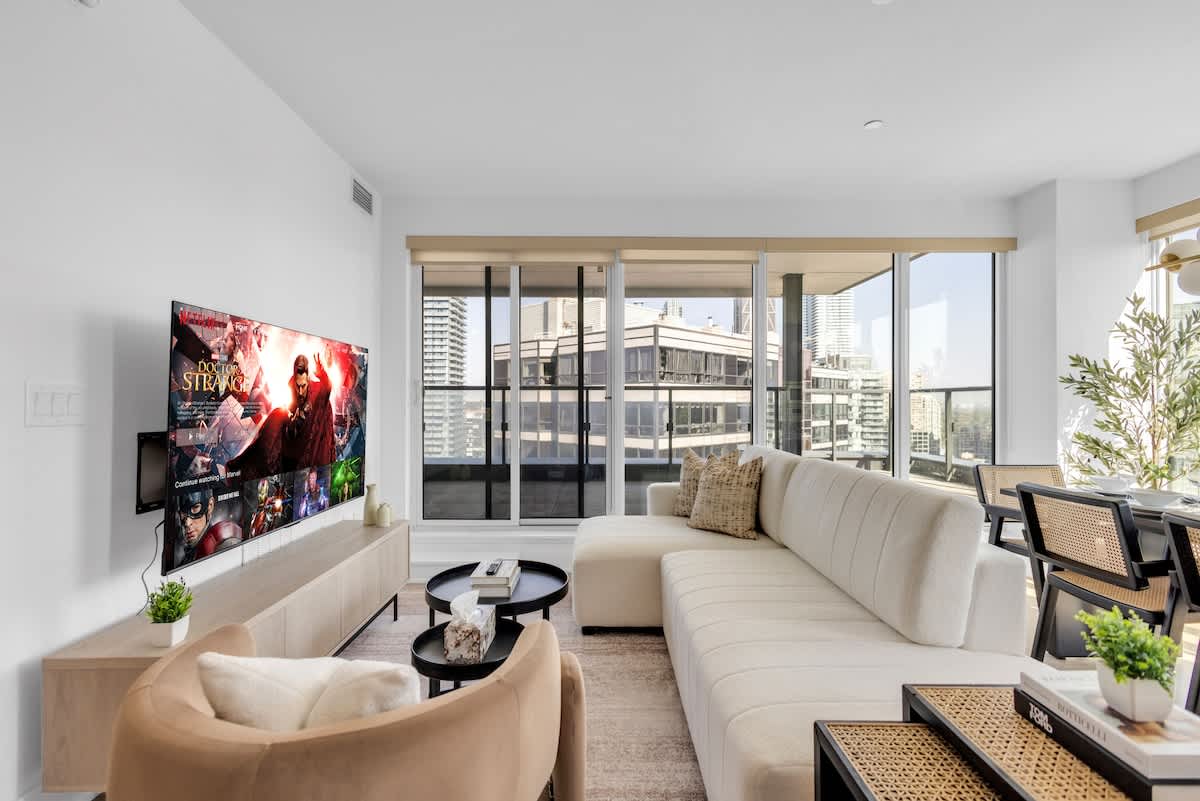 Located in the heart of downtown, this new modern and stylish 1 bedroom condo will be the perfect stay for your next Toronto experience. It features an open concept which blends functionality and comfort, it has soaring ceilings and floor-to-ceiling window. All major attractions and arenas are walking distance to where you will be staying. Events at, Roger’s centre, CN Tower, Ripley’s Aquarium, the Exhibition place, Scotiabank Arena, TIFF lightbox and Waterfront activities are a few mins away.