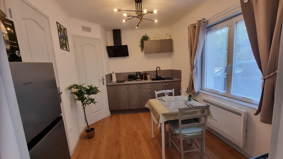 Logement entièrement rénové, cette dépendance au sein de notre corps de ferme conserve le cachet de l'ancien avec poutres apparentes dans une ambiance cosy et chaleureuse. Au cœur d'un village avec toutes commodités : boulangerie, boucherie charcuterie, supérette, pharmacie … Le logement offre de beaux volumes, avec cuisine équipée, 2 chambres, salle de bain avec douche et espace buanderie avec machine à laver. Bel espace extérieur aménagé et partagé en commun avec nos hôtes. Equipements bébé.