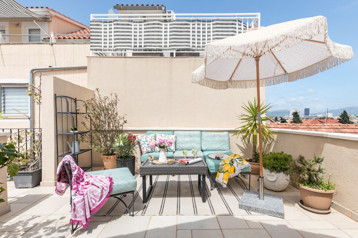 Immerse yourself in the tranquil ambiance of tastefully designed eclectic duplex. Throughout the flat, discover a harmonious mix of contrasting textures and patterns, accentuated by vibrant splashes of color and elegant French glass doors leading to the outside. After exploring the lively inner city of Split, unwind on the sundeck terrace with refreshing drinks. Experience the best of both worlds: the comfort and convenience of a hotel coupled with the privacy and coziness of a home.