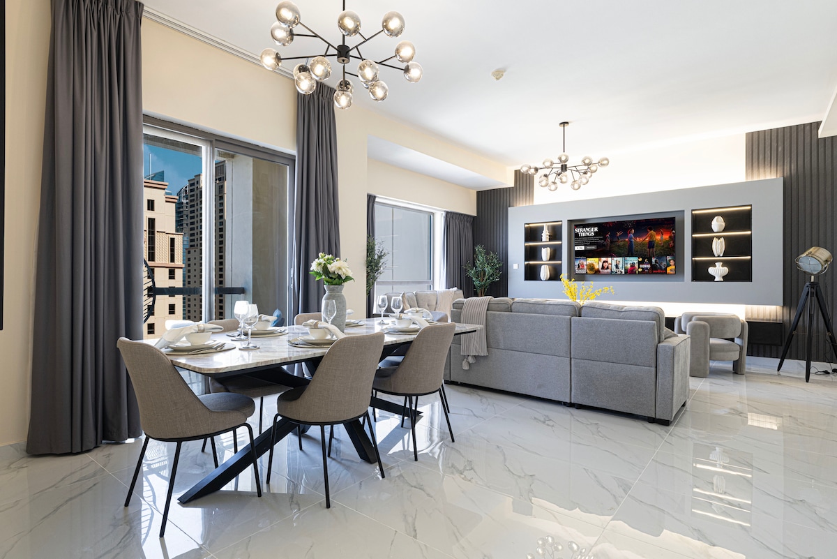 Bienvenido al nuevo departamento de 4 dormitorios (1 cama tamaño king y 1 sofá cama XL muy cómodo) y 1,5 baños, ubicado en el corazón de Dubai Marina. Vas a encontrar un refugio de lujo a pocos pasos del mar, los mejores restaurantes, tiendas, entretenimiento, centros comerciales y atracciones. Aventúrate por la ciudad o la playa desde esta ubicación privilegiada, luego retírate al departamento contemporáneo cuyo diseño elegante y su rica lista de servicios te dejarán sin palabras.