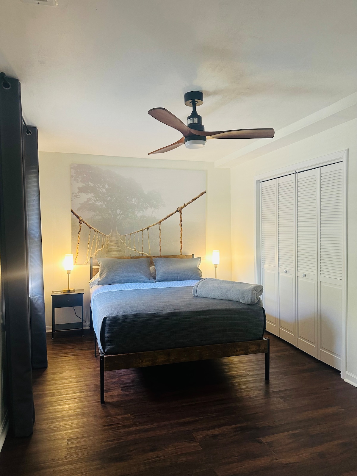 This wonderful cozy studio is super private, with its own entrance right on the side of the house. Plus, it comes with a full kitchen and bathroom. It’s a peaceful, private space with a well-equipped kitchen featuring a big refrigerator, a queen-size bed, a 45” smart TV, a private entrance, an outdoor deck that leads to the backyard, and parking right next to the unit. We’re just a 30-minute drive to downtown Atlanta, Mercedes-Benz Stadium, the GA Aquarium, and 15 minutes to Gas South Arena.