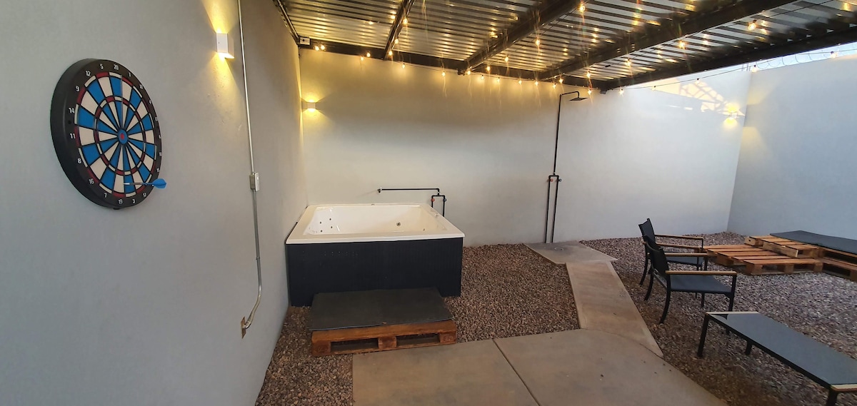 Casa contenedor única, moderna y funcional. A 12 min del centro histórico, junto al Parque Sahuatoba. Es un estudio de diseño industrial-moderno, combinando la eficiencia de una tiny home con las comodidades de un hotel. Tiene cama queen, sofá cama, baño privado, TV, WiFi fibra óptica y cocina equipada. Disfruta fogatero, asador, mesa de jardín y fregadero. Relájate en jacuzzi para 4 personas con ducha exterior. Ideal para escapadas tranquilas, pasar un rato de con tu pareja o familia.