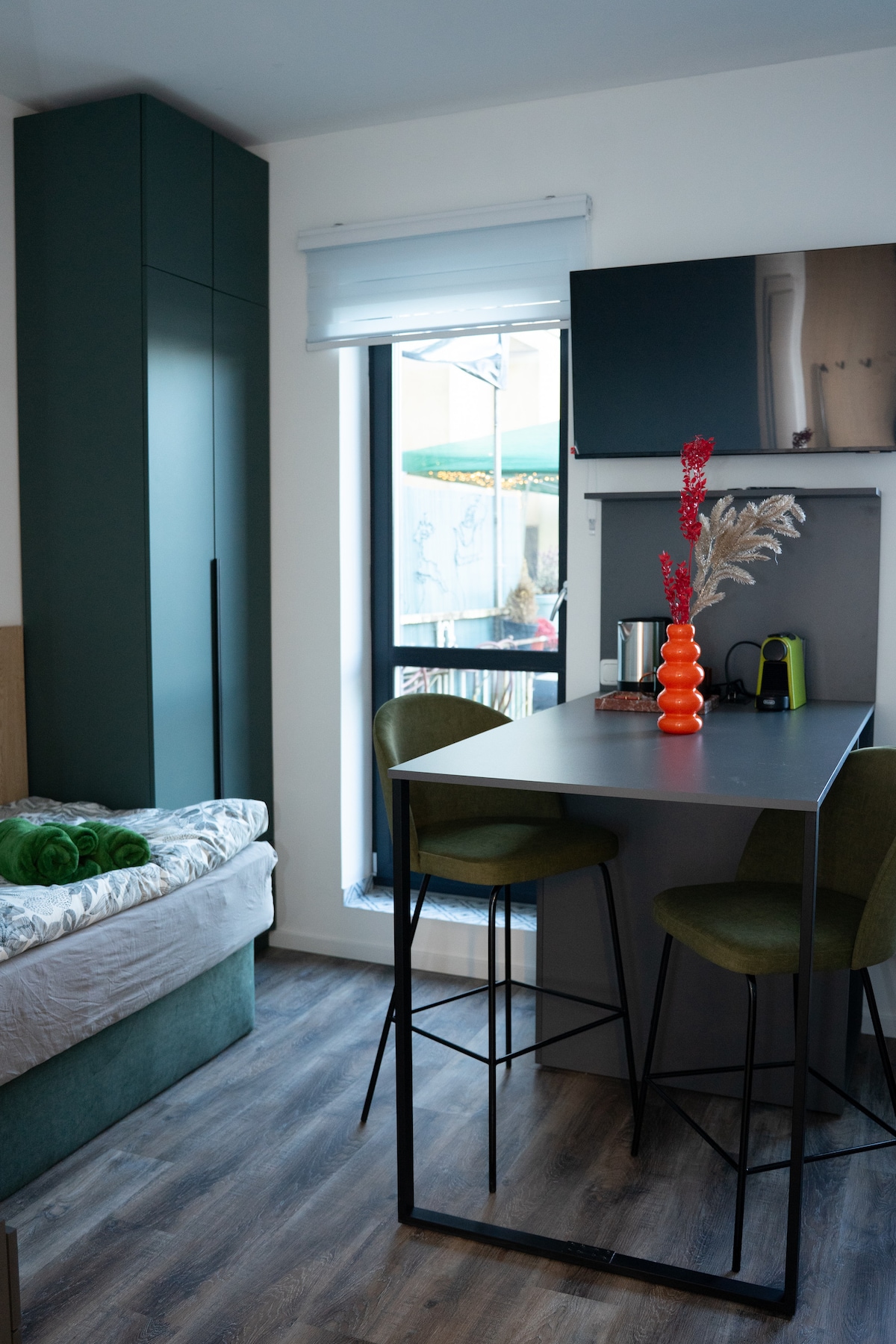 A quiet, stylish studio set in a protected courtyard, centrally located in Düsseldorf. A place to arrive, breathe and feel at home – great for business travellers, longer professional stays or private city breaks. Whether you want to work with focus, live in Düsseldorf for a few months, or simply unwind and recharge, this studio combines calm surroundings with immediate access to the city and public transportation.