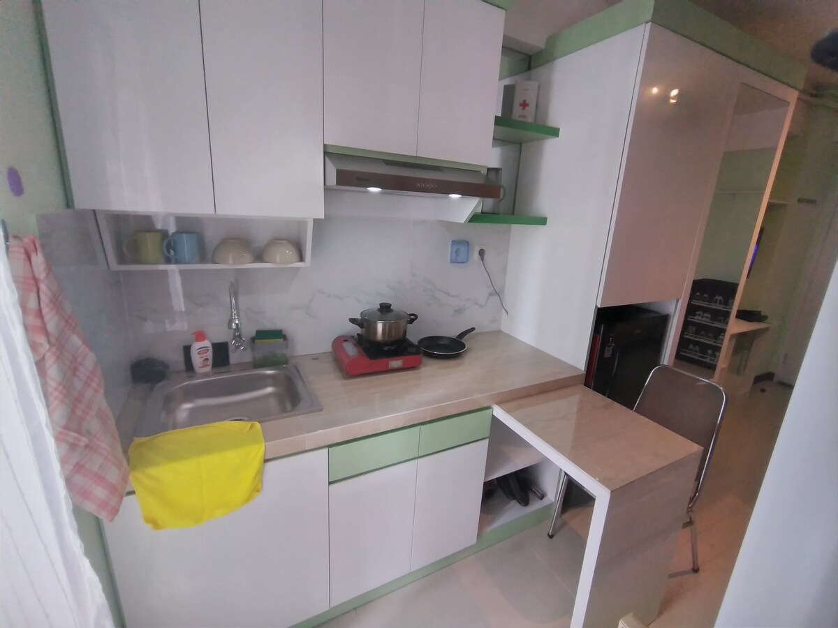 Sábanas limpias para cada nuevo huésped, apartamento de 2 dormitorios, todo en uno, todo lo que necesitas está aquí: TV por cable, wifi, cocina, agua, café, té, servicios, información, estación de cercanías, taxi, Grab, Gocar, centro comercial/supermercado/Indomaret, restaurante/cafetería, banco/cajero automático, lavandería, gimnasio, piscina, correr, tenis, baloncesto, clínicas/medicina, etc.