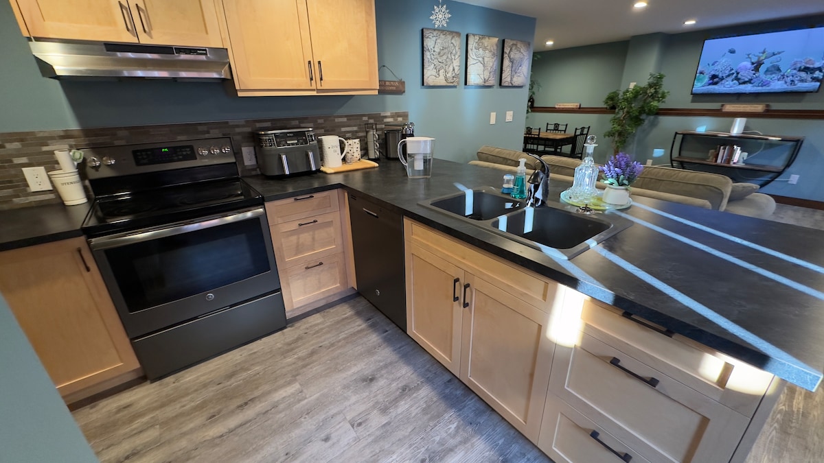 Our guest suite has a modern rustic feel & can accommodate 3 guests. There is an ensuite bathroom & a separate room with a microwave, hotplate, breakfast sandwich maker, mini fridge, Keurig coffee maker and a tea kettle. There are plates, bowls, cutlery, etc and a rustic wine barrel dining table. The cupboards are stocked with local tea and coffee, with cream in the fridge and snack. There is a bbq for guests use also