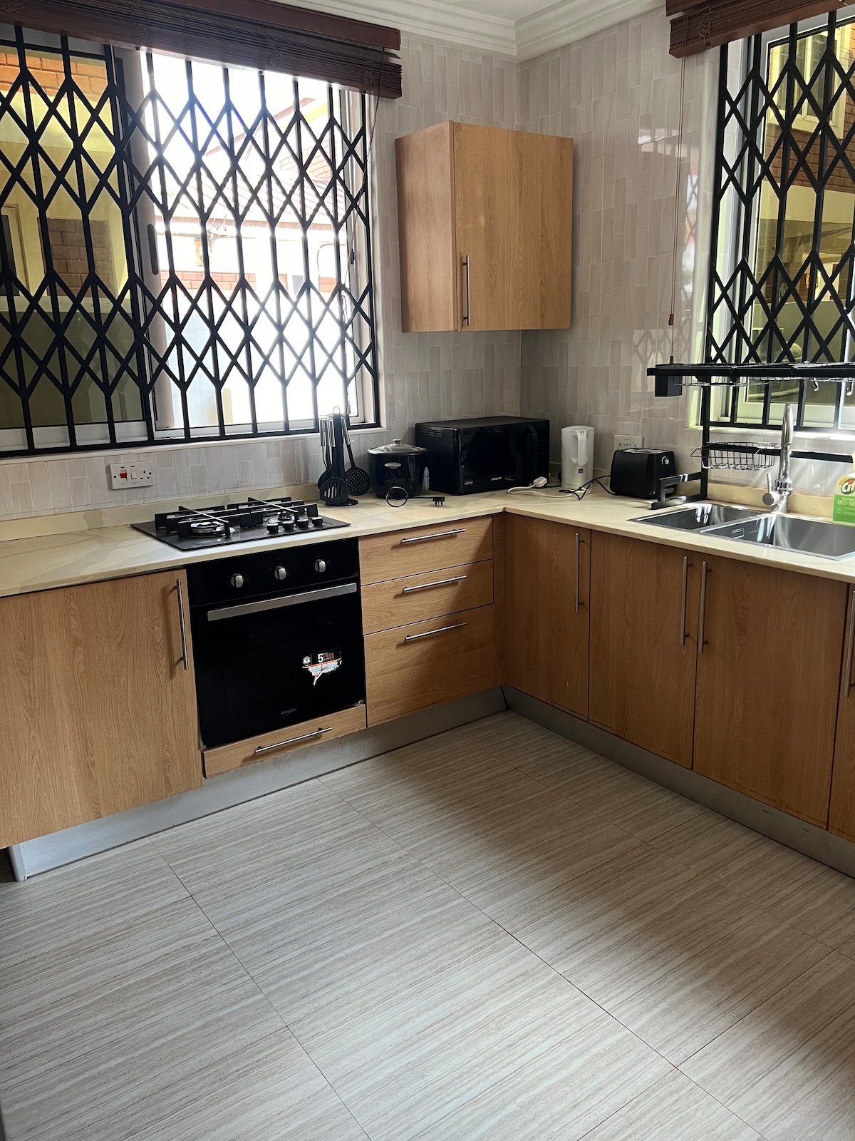 Escapate y relájate con toda la familia en este tranquilo lugar, en KAS Valley Estate, Oyibi, a solo 20 km del aeropuerto. Acogedora propiedad que ofrece serenas y hermosas vistas a la colina. Disfruta de una relajante escapada de fin de semana con todas las comodidades únicas. Reserva tu estadía hoy y disfruta de una comodidad real con tus seres queridos. Características principales: •Habitaciones con aire acondicionado • Wifi gratis para estadías cortas • Respaldo de energía solar •DStv para entretenimiento • Respaldo de agua •Gimnasio y piscina. • Estadías largas disponibles • Exclusivo para uso de los huéspedes