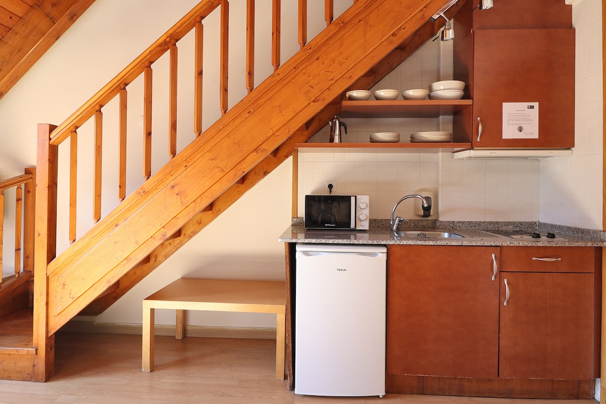 Home 5: Coqueto apartamento exterior de un solo dormitorio con cama de 1.35 mts y un baño con ducha. Se compone de un luminoso salón-comedor abierto con cocina con ambiente separado del dormitorio sin puerta divisoria. Posibilidad de usar el sofa-cama, ideal para hasta 3 adultos o parejas con 1 o 2 niños. El dormitorio también cuenta con Smart TV.