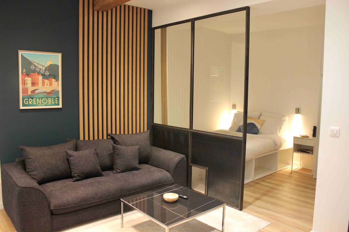 ¡Prueba la elegancia de este alojamiento excepcional! Completamente renovado por un arquitecto con materiales de alta calidad, este hermoso departamento de 90 m2 está compuesto por una sala de estar (sala de estar, cocina abierta), 2 dormitorios grandes, un vestidor, un baño de mármol con ducha a ras de suelo y 2 balcones amueblados. Ventajas: - aire acondicionado - Inalámbrico - lavadora - lavavajillas - ropa de cama y toallas incluidas ¡Ideal para disfrutar plenamente de Grenoble y sus alrededores!
