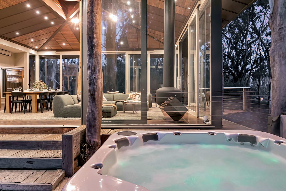 This entire award-winning home with rustic charm and modern elegance, 300 meters from the Murray River and 20 minutes from Echuca, invites you to unwind in the heart of river country. Enjoy exclusive use of the house with four queen bedrooms, bush views, an enclosed veranda for alfresco dining, and a soothing heated plunge pool. A place to rest, reconnect and breathe again. Whether you seek peaceful relaxation or the thrill of a river adventure, Wisps of Wool Retreat is the perfect place.