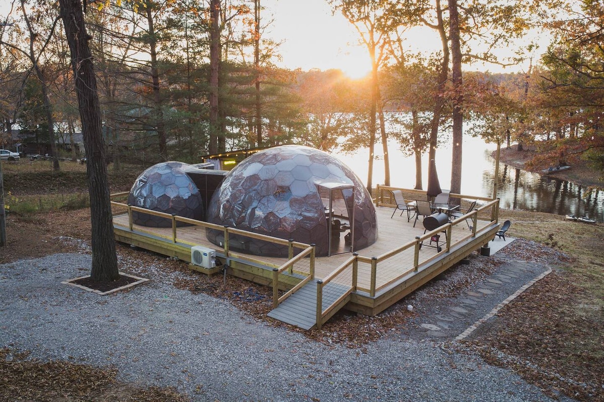 Adventure meets comfort at the Space Cowboy Lake Domes — the ultimate glamping experience where rustic frontier charm collides with sleek modern design. This unique double-dome retreat features a full kitchen, bathroom, and space for up to four guests across two connected domes — one with a cozy living area and sleeper sofa, the other with a private queen bedroom. Step outside to your expansive lakefront deck with a hot tub, fire pit, grill, outdoor shower, and private lake access and kayaks.