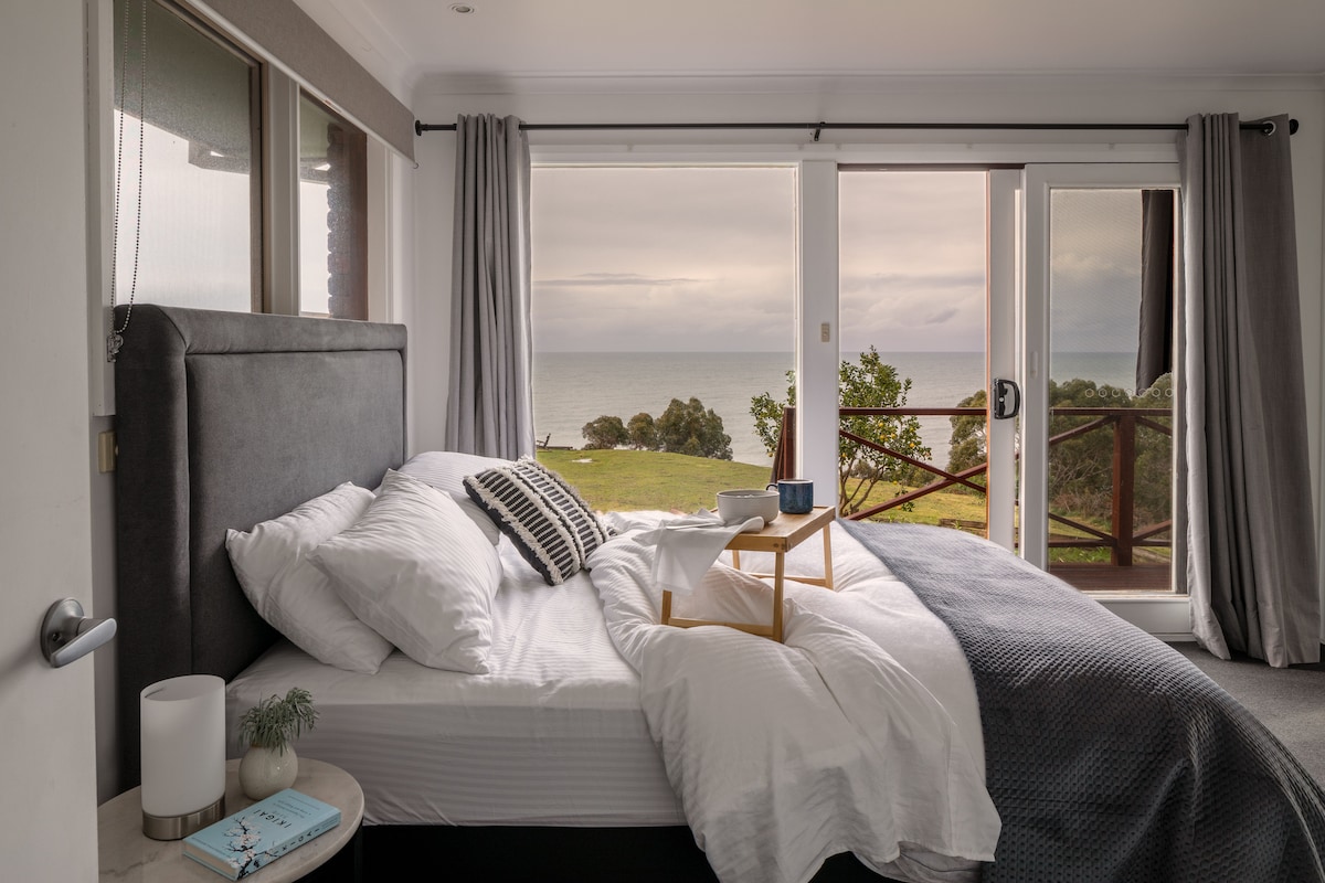 Summer House is a beautiful house designed for a relaxing summer holiday or a snug winter getaway. Located in an elevated position just a series of steps down on to the pristine sands of Boat Harbour Beach on Tasmania’s north-west Coast. Featuring a light flooded, state of the art kitchen and open plan living/dining areas and two elevated decks. An expansive terrace provides breathtaking 180 degrees views of the Sea and Boat Harbour Beach. Three night minimum stay.