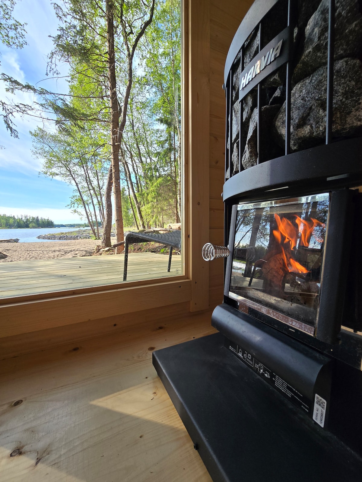Villa tranquila junto al lago. Superficie: 80 m2 interiores + gran terraza y sauna exterior El número de camas es de 6 camas separadas. Habitaciones: cocina, salón, 3 dormitorios, vestíbulo, baño y sauna Instalaciones: chimenea, nevera/congelador, cocina eléctrica y horno, lavavajillas, microondas, cafetera, hervidor de agua. En el patio hay otra sauna de playa.