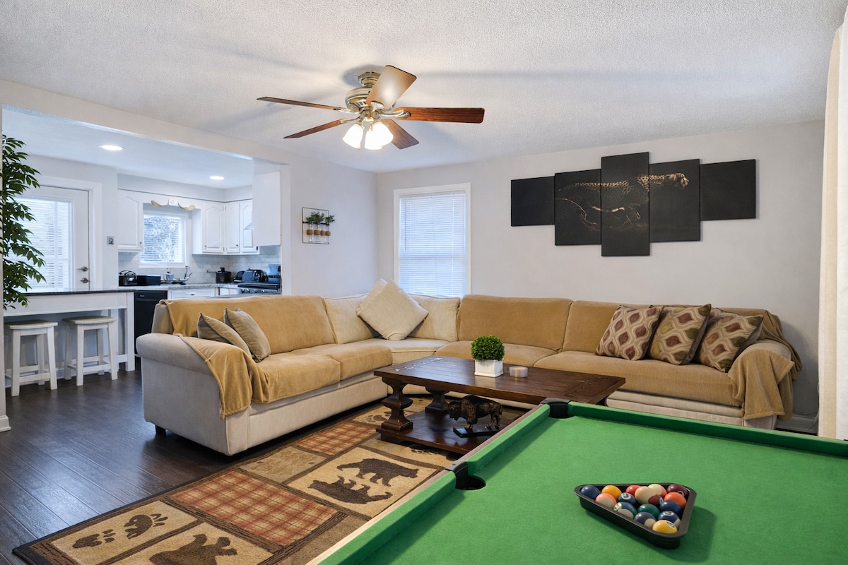 Características principales: 🔹 2 camas tamaño king, 2 camas tamaño queen, 1 cama completa, 2 camas individuales, 1 minicuna plegable, 1 colchón de aire queen 🔹 Piscina 🔹 Mesas de póquer y futbolín 🔹2 salas de estar Y sala de juegos 🔹 3 chimeneas y un brasero Espacio de juegos para🔹 niños y comodidades Cena 🔹 al aire libre, barbacoa y sala de estar Ubicado en Amherst, Nueva York, Oasis es perfecto para familias ampliadas y multigeneracionales, fiestas de bodas, una escapada de chicas maduras o grupos grandes que viajan juntos y duermen durante 12 personas cómodamente (+bebé y niño pequeño).
