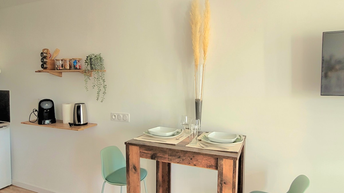 Un appartement de 35 m2. Pour couples ou solos, en balade ou pour le travail. Un endroit calme, mais plein centre ville du Puy Sainte Réparade. TV avec Netflix, Canal +, OCS, Disney +, Paramount. Lit double. Salle d’eau. Coin tisanerie / petit déjeuner. Équipé d’une bouilloire, machine à café, réfrigérateur, micro-onde, évier. Pas de table de cuisson. Lave-linge séchant. Possibilité de stationnement gratuit à 2 pas.