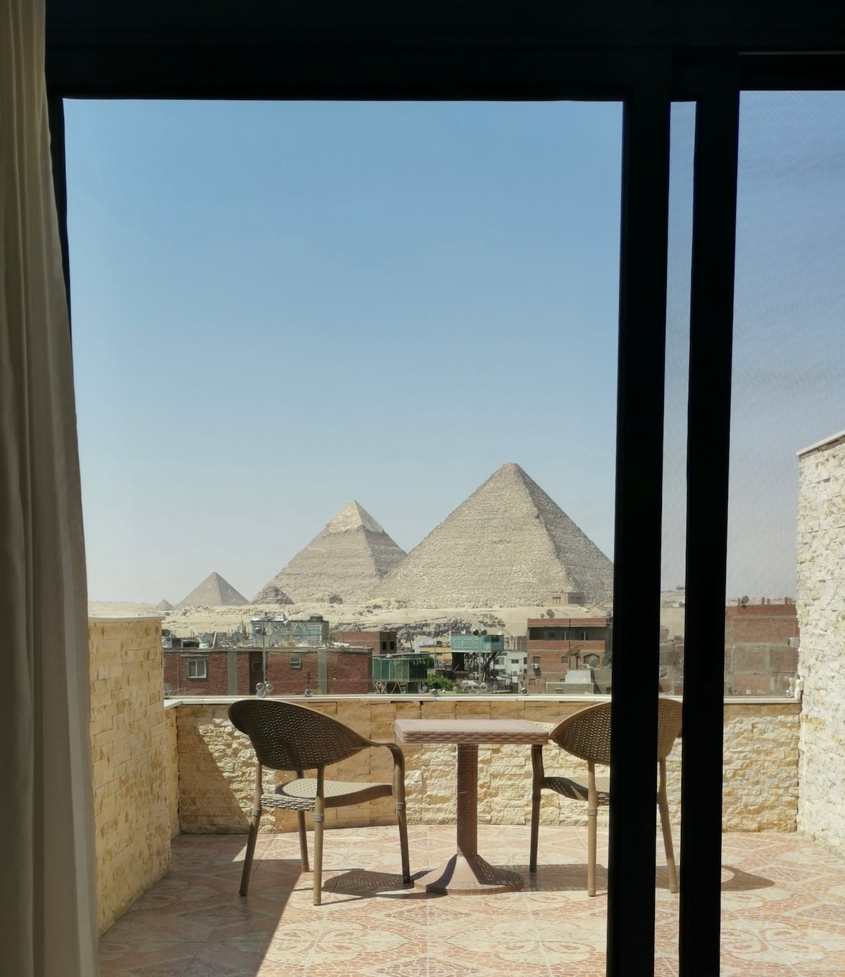 Te damos la bienvenida a nuestro encantador alojamiento de 1 dormitorio en Guiza, donde podrás disfrutar de unas vistas espectaculares de las Grandes Pirámides desde tu balcón privado. Con una cama cómoda y un baño privado, este espacio es perfecto para relajarse después de un día de exploración. Ubicado a solo 5 minutos en auto de las pirámides de Guiza y del Gran Museo Egipcio, nuestro apartamento también está a poca distancia a pie de encantadores restaurantes, cafés y supermercados. Disfruta de un desayuno de cortesía en nuestra cafetería en la azotea.