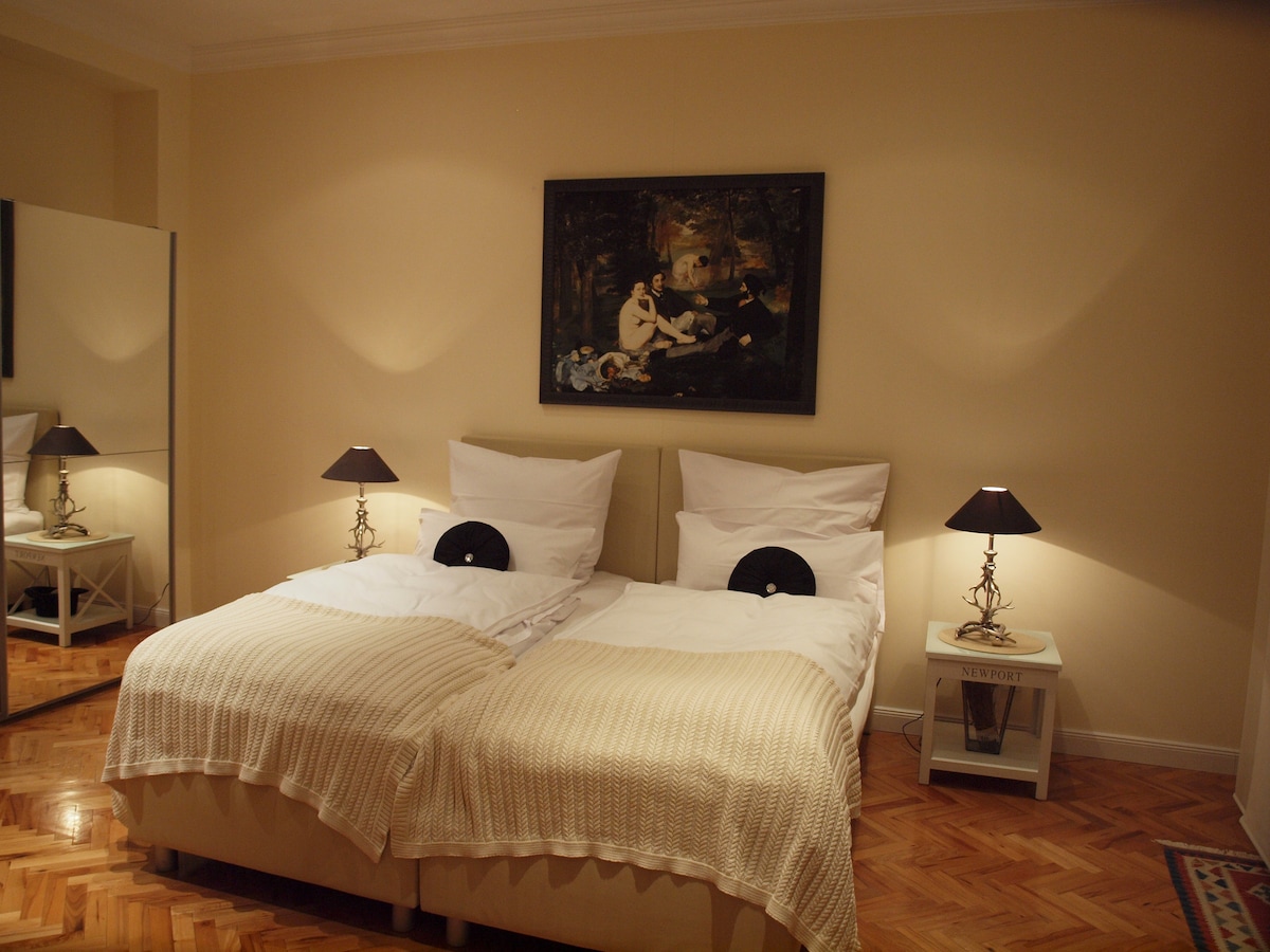 Spacious, voluminous loft-like apt with a HUGE room (50 m2). Located on the ground floor in quiet backyard. U-station and tram stop in front of the house. Ideal for a SHORT stay of up to 3 persons. PROS: best city location + stable WiFi + queen size bed (180x200) and single bed (90 x 200) + washing machine + cool in summer + hairdryer + coocking facilities + check-in at night possible + babybed CONTRAS: little & uncomfortable bathroom - no parking places in the area - no TV - EXPENSIVE
