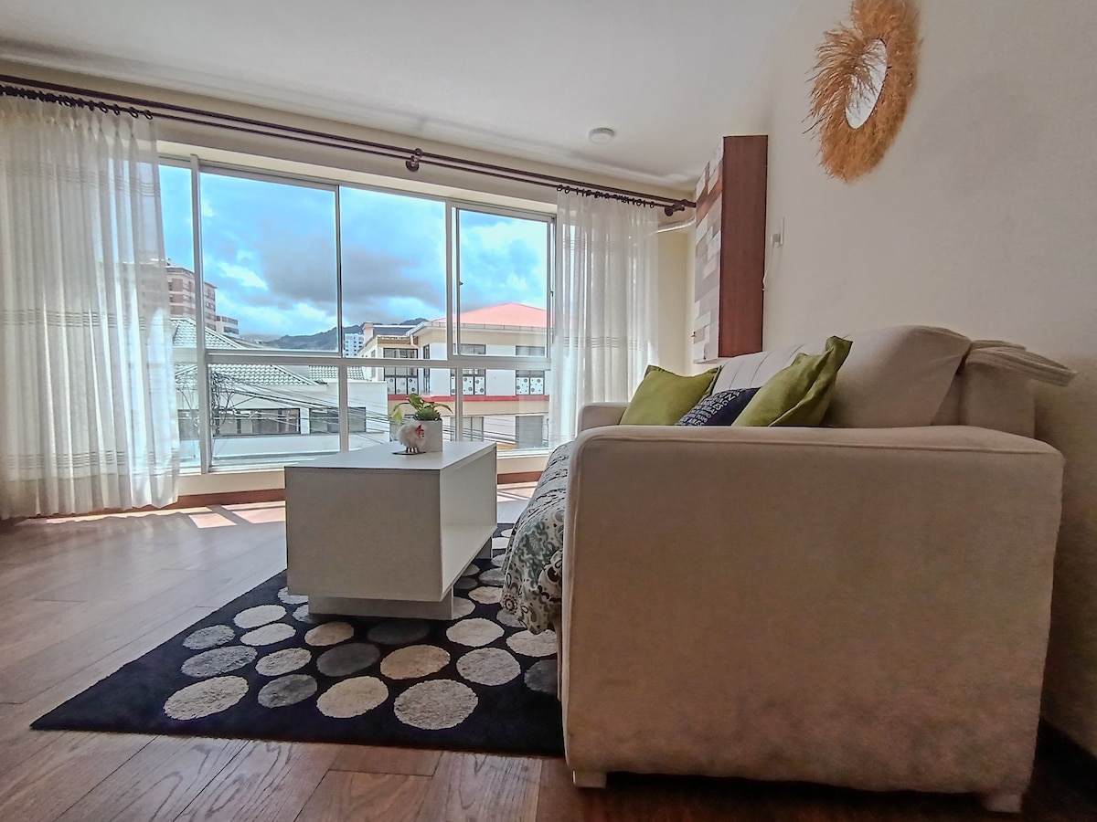 Excelente ubicación, vista panorámica del piso 14, edificio moderno, cerradura inteligente, ascensor con tarjeta, 35 Megas, calefacción y garaje Un dormitorio en suite y otro con cama doble Comedor, living con dos sofá cama (doble y simple), 2 baños (secadora de pelo), lavandería (lavaropa, plancha), cocina, extractor de grasa, refrigerador, microondas, licuadora, caldera eléctrica, cafetera, horno Cerca: Embajadas (Alemana, Americana, Argentina, Brasil, España, Japón), Supermercados, Teleférico