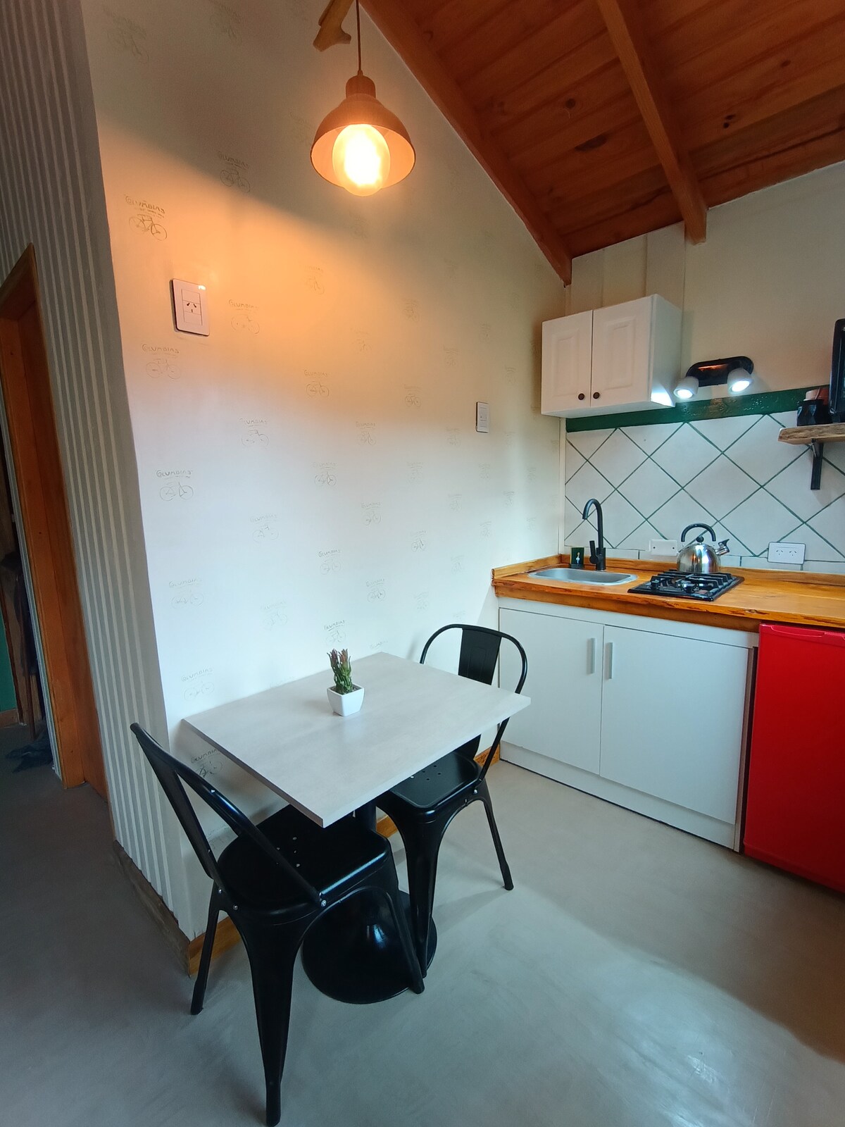 Estudio Vintage, cálido y luminoso, ideal para parejas, viajeros solitarios o escapadas tranquilas. Está ubicado dentro de una propiedad familiar rodeada de naturaleza, con mucha luz, vista verde y detalles en madera que le dan un ambiente patagónico acogedor. El espacio es totalmente independiente: tiene su propia puerta de entrada, cocina completa, baño privado y parrilla. El uso de la tinaja tiene un costo adicional de U$20 x día. Incluye la preparación con agua caliente y toallas extras.