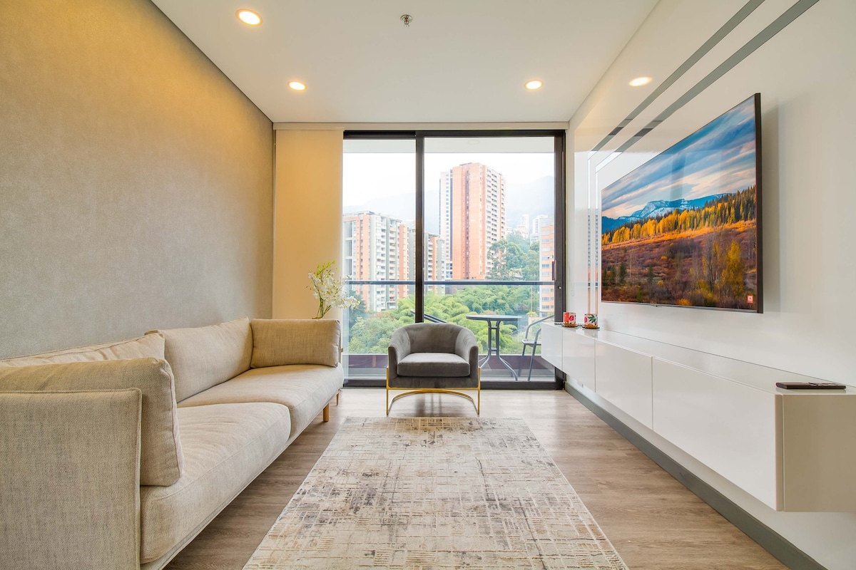 Brand new apartment in the heart of Poblado, Medellin. Just few minutes from Parque Lleras, Golden mile, and the top restaurants of the city. This modern space features a 2 bedroom/2 bathroom layout with an spacious living area, a fully equipped kitchen, and astonishing views. Each room has its own A/C unit, 55" TV with Netflix, and remote controlled lights. Among the building amenities, you will find an outdoor swimming pool, a fitness center with a shared lounge, and a restaurant.