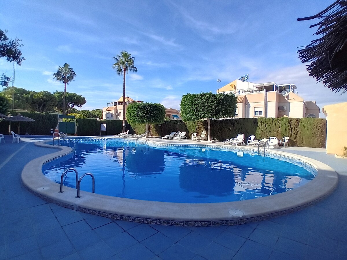 La casa está equipada para un descanso tranquilo. Hay tiendas y restaurantes a 5 minutos a pie. La casa se encuentra junto a los campos de golf de Las Rambas. Un sendero para caminar y montar en bicicleta pasa justo al lado de la casa. A 5 minutos en coche del mar. El gran centro comercial La Zenia Boulevard se encuentra a 3 km. La casa de campo con solárium está orientada al sur. La casa de campo cuenta con plaza de aparcamiento propia y una piscina bellamente ajardinada con vistas a la naturaleza.
