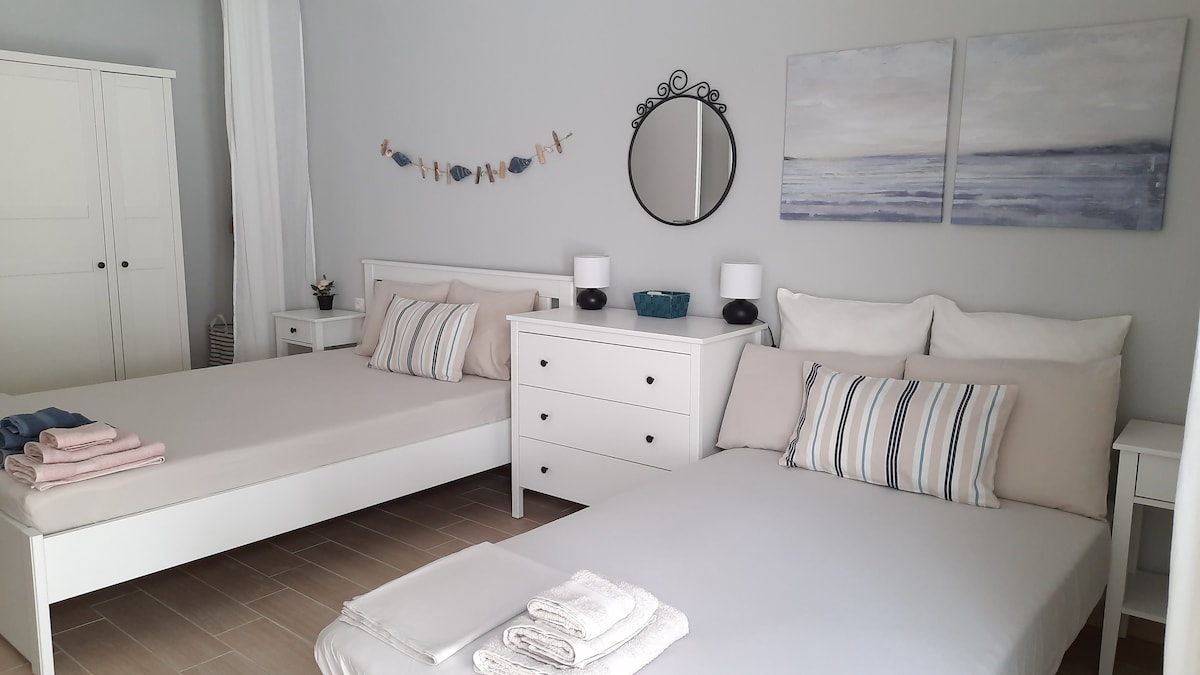 Un impresionante apartamento en la parte superior, segundo piso (solo por escaleras), situado justo en el agua. ¡Es cómodo, con un gran balcón y unas vistas impresionantes! Se encuentra en el centro de la ciudad y la playa es ideal para familias que buscan unas vacaciones tranquilas. Hay supermercados, chiringuitos y tabernas a poca distancia a pie del apartamento. El apartamento tiene dos dormitorios, sala de estar con sofá cama, cocina totalmente equipada, aseo y ducha. ¡A solo 20 minutos en coche del aeropuerto y a 25 minutos de Tesalónica!