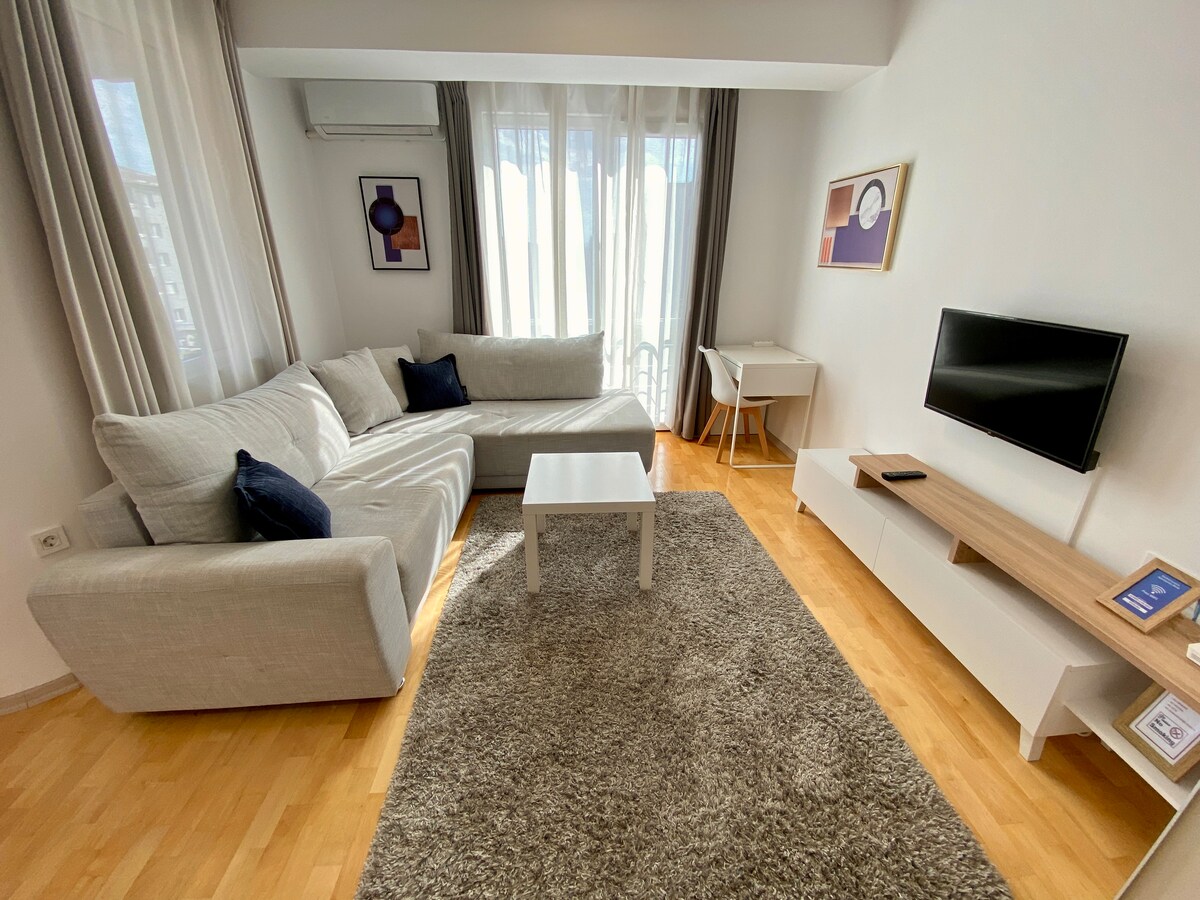 New and modern 1 bedroom apartment, fully equipped kitchen, living room with corner sofa that makes a double bed. Very Fast Fibre Optic WiFi Internet with speed of 100 Mbps/ 100 Mbps (download and upload) ideal for everyone who needs fast and stable internet for working online, video conferencing, playing games, etc. Led TV with more than 100 most popular channels, air conditioning, washing machine, hair dryer, iron and everything you need to have a pleasant stay.