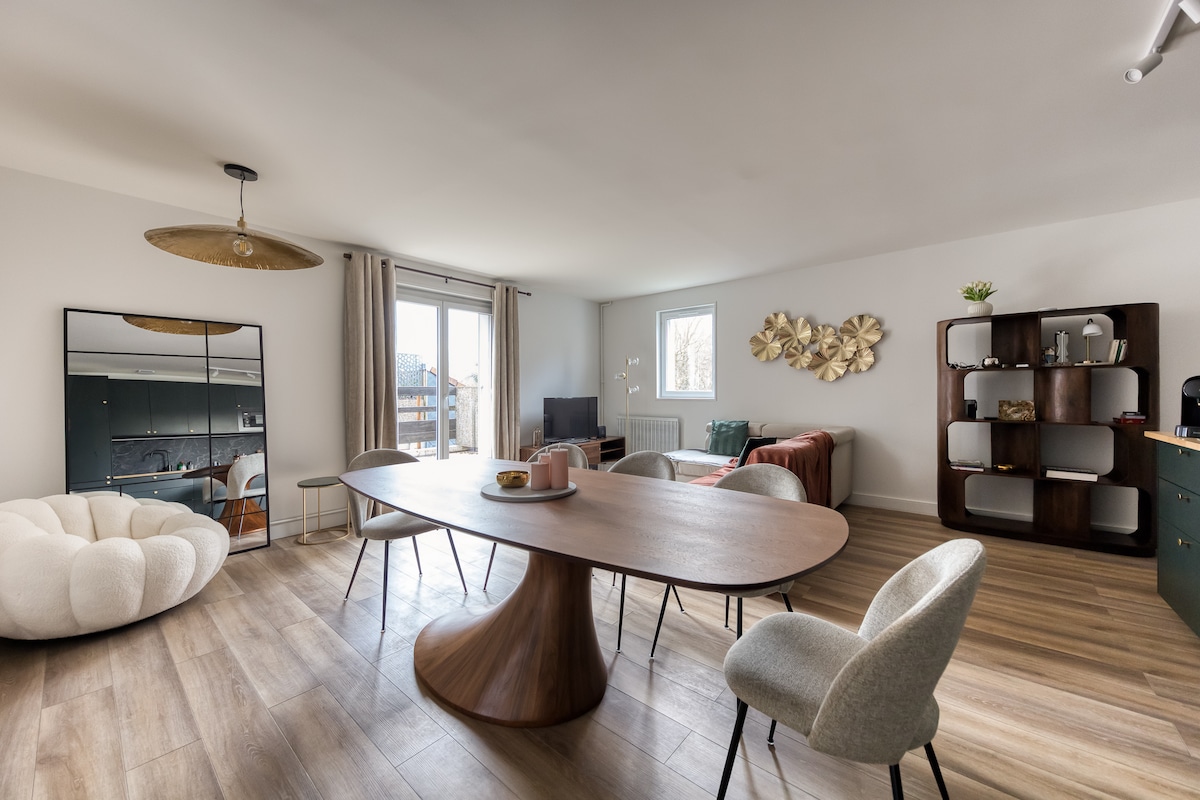 Una decoración de estilo escandinavo depurado . Suministro de un retroproyector y una pantalla grande. El Apartamento está en una zona tranquila y apacible, con vistas a la antigua plaza de la ciudad con algunas tiendas al pie del edificio (panadería,banco , farmacia , sándwichería pizza tienda de comestibles ,floristería ,peluquería, etc.) Centro comercial Carrefour a 1 km, muy cerca. Edificio con TV de vigilancia en la entrada y también en el pasillo de arriba. Apertura a distancia